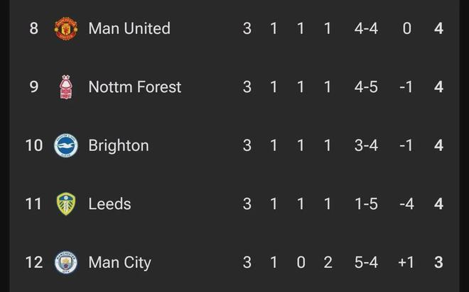 这场失利后,曼城在前三轮英超联赛仅拿到3分,这一开局让球迷开始质疑他们本赛季是否具备持续争冠的实力。要知道,同城对手曼联队前3轮踢得磕磕绊绊,他们还拿到了4个积分。而瓜迪奥拉的球队却在前3轮比赛中仅拿到3分,排名英超第12位。