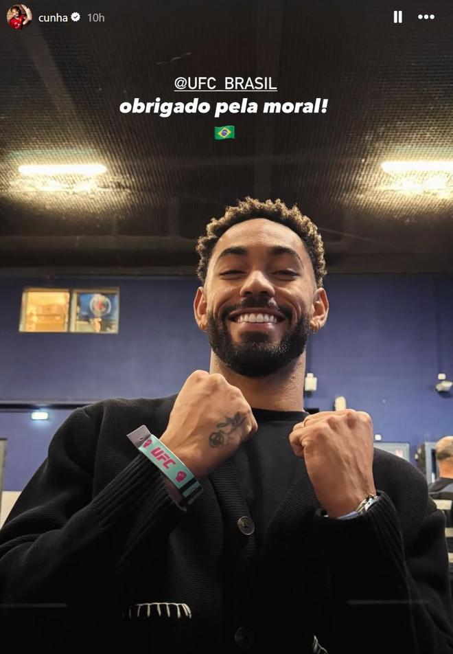 随后,库尼亚分享了一张他戴着UFC腕带摆姿势的照片,并写道:“感谢支持(obrigado pela moral)”。