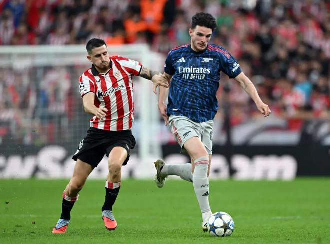 一帮巴斯克人挑大梁的英格兰球队访问巴斯克俱乐部,想想这画面你都觉得诡异。阿森纳在头一个小时里略占上风,毕竟阵容造价是对方的47倍——你没看错这数字。但无论是埃泽领衔的地面渗透,还是哲凯赖什的空中优势,都对毕尔巴鄂没有实质威胁。马杜埃凯的底线倒三角,埃泽没来得及扣扳机,球就被解围;廷贝尔的传中找到了哲凯赖什,可惜他鱼跃冲顶擦着门柱飞出底线。赖斯操刀定位球,哲凯赖什后点一敲,还是打偏。阿尔特塔唤出特罗萨德和马丁内利,改变比赛走势。