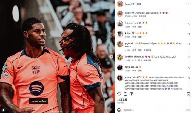 9月19日讯 巴萨在本轮欧冠焦点战2-1力克纽卡斯尔,孔德首发表现出色。第58分钟,孔德接到队友传球,在右路送出传中,禁区内拉什福德头球破门。他也在赛后通过社媒晒出同拉什福德的