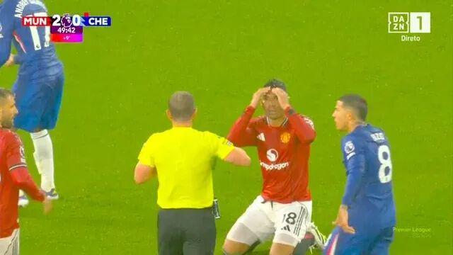 卡塞米罗此前已对恩佐·费尔南德斯犯规吃到黄牌,上半场补时阶段又因拉倒安德烈·桑托斯领到第二张黄牌,被罚下场。