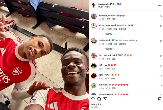 赛后,阿森纳前锋萨卡晒出与队友加布里埃尔的合照,庆祝这场比赛的胜利。