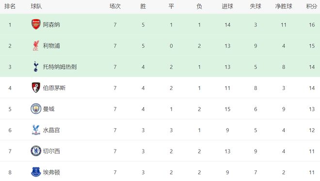 在积分榜上,阿森纳以16分高居榜首。利物浦15分排名第2。第3的是热刺,拿到14分。伯恩茅斯这匹大黑马也是14分,排名第4。曼城慢慢追了上来,4胜1平2负,拿到13分,排名第5。第6的是水晶宫,拿到12分。切尔西以11分排第7。而曼联的战绩是3胜1平3负,排名掉到第10。