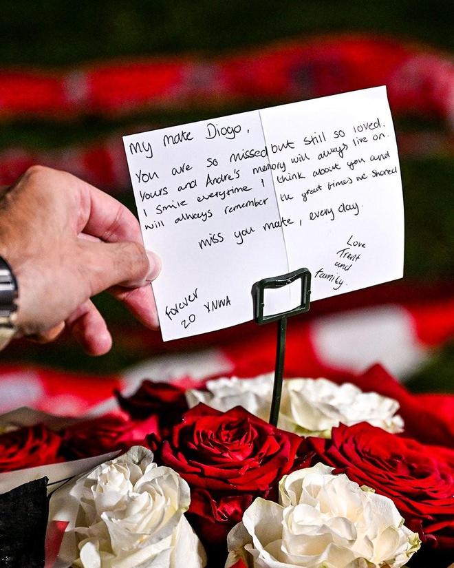 照片显示,阿诺德献上的鲜花上有一张手写卡片,内容是:“我的挚友迪奥戈,我们非常想念你,但你依然被深爱着。关于你和安德烈的回忆将永存。每当想起你,我都会微笑,我会永远记得我们一起度过的美好时光。兄弟,每天都想你。永远的20号,YNWA。”