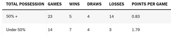 在考虑曼联的控球率与他们赢球或甚至平局能力之间的联系时,比赛状态很重要。
