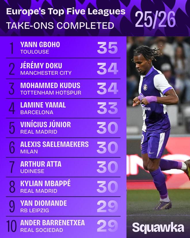 图卢兹前锋格博霍在本赛季12场法甲斩获3球1助攻,据统计,他还完成35次过人,力压多库、库杜斯等人,排在欧洲五大联赛首位。五大联赛本赛季成功过人榜格博霍(图卢兹) 35次多库(曼城