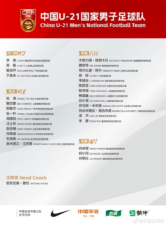 U21国足集训名单:向余望、何小珂、木塔力甫在列,铜梁龙5人