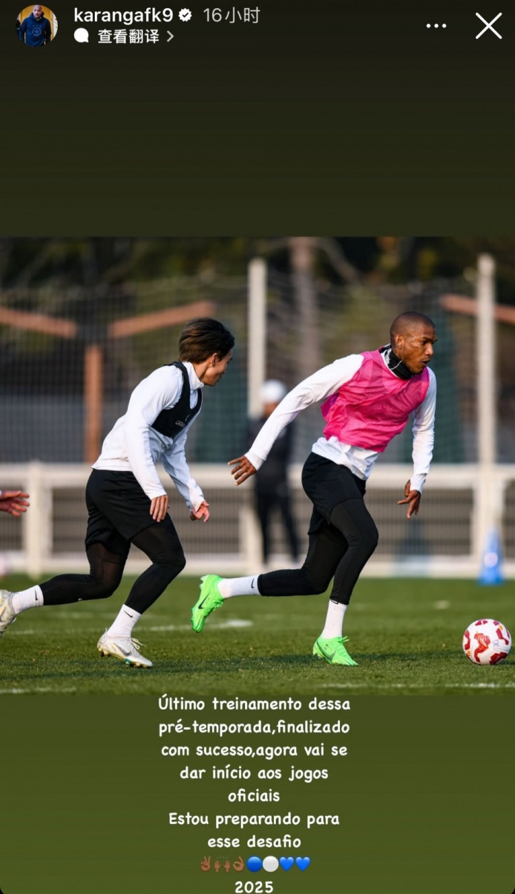 2月21日讯 昨天,大连英博外援卡兰加更新社媒,展望了即将到来的新赛季。卡兰加在社媒晒照并配文写道:“新赛季开赛前最后一次训练圆满结束,现在新赛季的比赛要正式开始了,我也正为