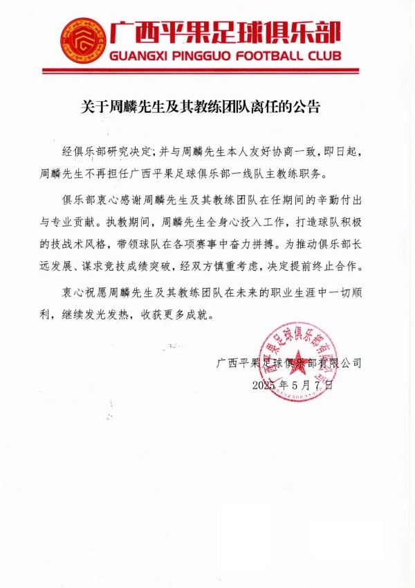 经俱乐部研究决定,并与周麟先生本人友好协商一致,即日起,周麟先生不再担任广西平果足球俱乐部一线队主教练职务。