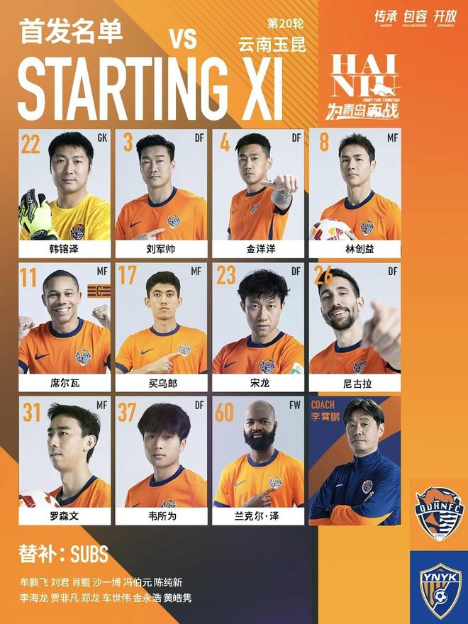 此役,青岛海牛主帅排出541阵型,以稳固防守为基础,伺机发动快速反击。锋线上,兰克尔-泽顶在最前担任支点;中场由买乌郎-米吉提、罗森文、林创益和韦林顿-席尔瓦组成进攻梯队,兼具冲击力与创造力;后防线则由韦所为、尼古拉-拉德曼诺瓦茨、金洋洋、刘军帅和宋龙五人联手,辅以门将韩镕泽,构建起坚实屏障。