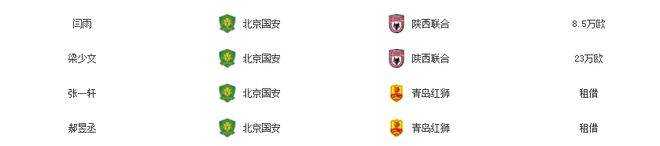 张一轩、郝昱丞被租借到中甲青岛红狮。截至中甲第22轮,张一轩已获得20次出场机会,郝昱丞获得12次出场机会。